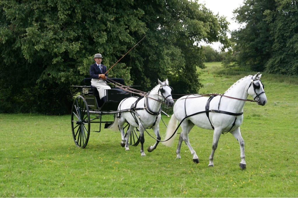 Original Windover Dog Cart circa 1900 to suit 14.2-15hh with 56" diameter wheels. Painted dark green with lighter green coach lines. Navy blue Melton upholstery. Spares box under passenger seat. Body adjusts to obtain correct balance. Measures 55" from tug to splinter bar. In top show condition. This beautiful top quality carriage has been shown with huge success and only for sale due to owners retirement. One not to be missed. (Hampshire)